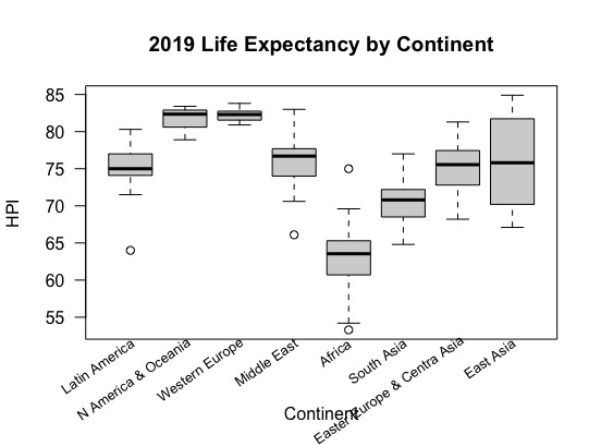 Here is an example of a boxplot graph using the Happy Planet Data Set: