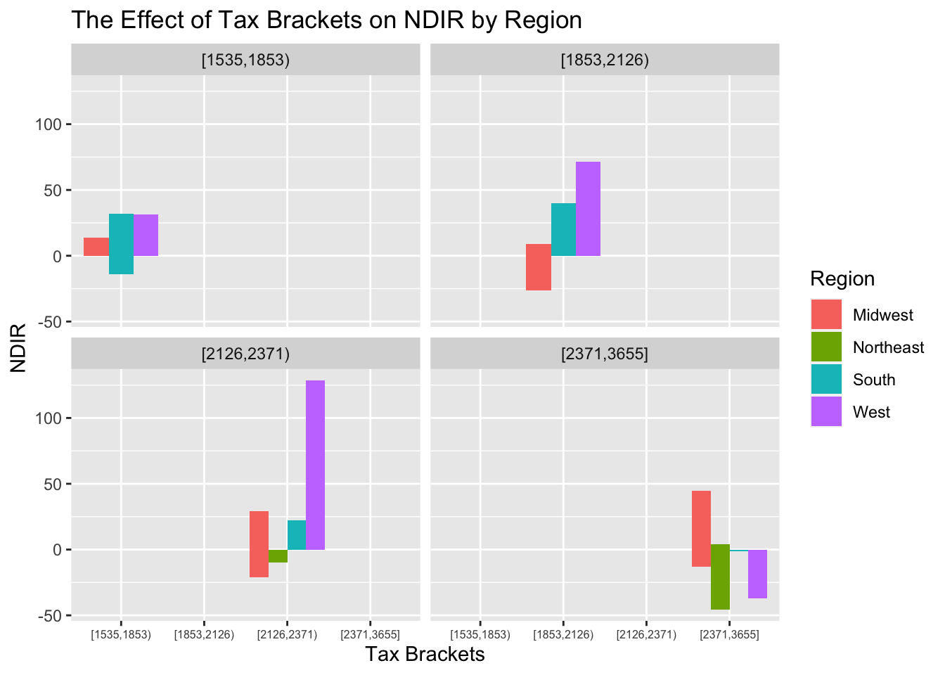 p + ggtitle ("The Effect of Tax Brackets on NDIR by Region" ) + xlab ("Tax Brackets" ) + ylab ("NDIR" ) + guides (fill= guide_legend (title= "Region" )) + theme (axis.text.x = element_text (size = 6 ))